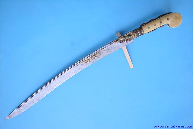 Fine Ottoman Balkan Yataghan sword with 24 inches blade finely fullered below the spine and inlaid with Koftgari gold work: Arab inscription and possibly the date 12?7 (1800-1900 in the Gregorian Calendar), most probably second half of the 19 C. Walrus grips with finely gilded filigree bolsters and grip strap set with big ribbed drop shaped corals and green colored stones on the bolsters Total length 29 inches. Very good condition. Left grips cracked as common with these Yataghans. No scabbard |