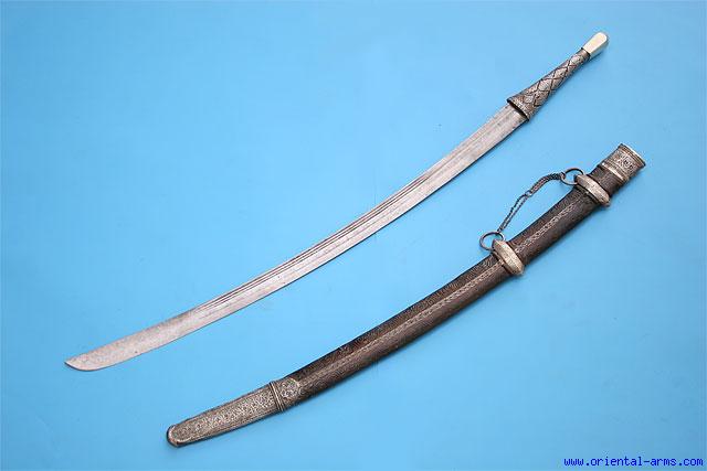 This very fine sword / saber from Oman is a very rare variant of the Kattara classical sword from the same place, see example: Iaroslav Lebedynsky Les Armes Orientales Page 78. The 30 inches fullered blade is most probably a European trade blade, mid 19C. or so. The handle is a fine embroidery of leather and silver strips in a geometrical pattern. The heavy pommel square block is steel covered with silver sheet. The scabbard is covered with beautifully tooled leather with a silver wire seam and mounted with two beautifully chiseled silver carrying rings and chased silver locket and chape. Total length 38 inches. Very good condition. A very fine sword. |