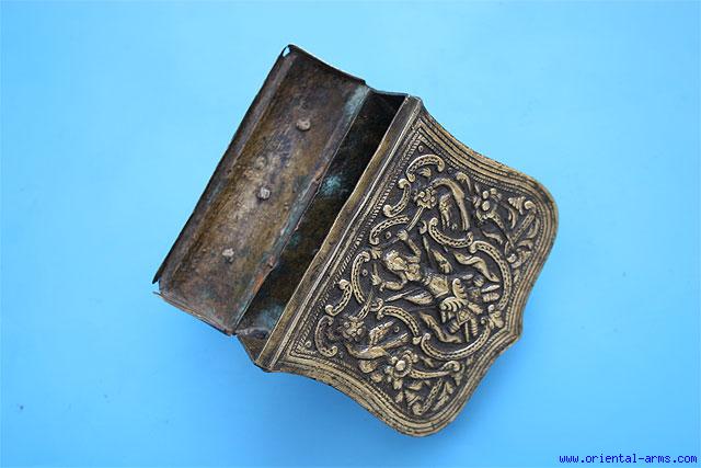 A container to hold bullets, made of chased heavy brass, 4 inches wide, 5 inches tall with a top hinged lid. Balkan origin, probably Greek, late 19 C. Very good condition.
