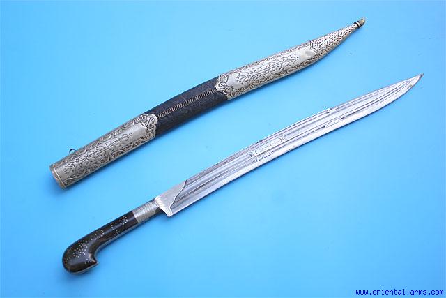This type of short sword is believed to come from the shores of the black see, north Turkey, Trabzon region. It is mid to late 19 C. with a finely forged multi-fullered blade17 inches long with engraved inscription in Arabic letters. Horn grips decorated with white metal nails. Original scabbard with spiral stitched seam and chased white metal mounts. Total length 24 inches. Very good plus condition. |
