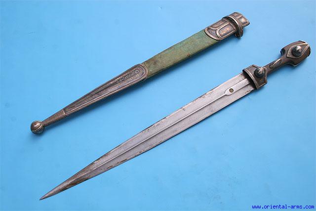 This is a very good Qama with a fine steel blade of hollow diamond cross section, marked with a maker mark set in gold. Horn grips with nielloed silver mounts. The scabbard is covered with green leather and mounted with engraved and nielloed silver locket and chape en-suite with the handle. The back of the locket is dated 1345 (1926 in the Gregorian calendar). Blade length 15 1/2 inches. Total length 22 inches. Very good condition. |