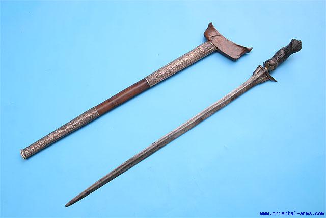 A Keris Penjang , also sometimes referred to as Execution Keris from Sumatra. This rare type of Keris was supposedly used to execute criminals. The long narrow blade was inserted above the collarbone of the sitting executed person and pushed down directly into the heart, causing instant death. The blade of this specific Keris is 18 1/2 inches long, forged from pamor steel. The hilt is finely carved horn. Metal mendak. Wood scabbard with long chased silver mounts. Total length 23 inches. Very good condition. Few blackened spots on the blade. |