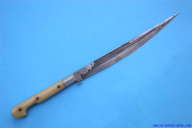 This type of knife is believed to come from the shores of the black see, north Turkey, Trabzon region. It late 19 C to early 20C. with a finely forged multi-fullered blade, 7 1/2 inches long, bone grips and white metal bolsters and grip strap. Total length 11 inches. Very good condition. No scabbard |