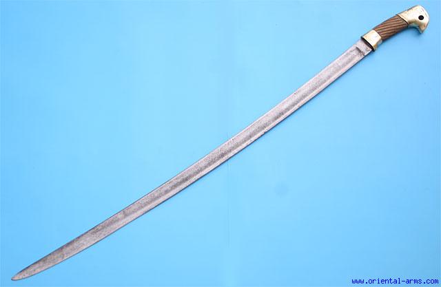 This is a Russian Military shashqa sword. Early 20 C. Blade 32 inches. Ribbed wood grip with heavy brass mounts engraved. The collar is marked with the letter W and engraved number 1774696 . Total length 37 inches. Very good condition. Cracks on the grip. No scabbard. |
