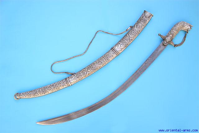 This is an Arab Saif coming from Arabia or a neighbor country. It employs a very fine Wootz blade of high contrast with a chiseled maker mark and traces of gold inlay. The blade is 32 inches long, heavy and nicely fullered, most probably of Persian origin, Late 18 to early 19 C. Some time in the late 19 or early 20 C. it was mounted with an Arab style handle and scabbard of finely chased white metal or very low silver alloy. Total length 38 inches. Very good condition. Minor edge nicks on the blade and small dents on the scabbard. Very impressive sword. |