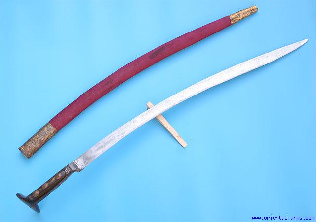 This style of yataghan with wide T shaped pommel ears are believed to come from central Turkey. This one has a blade of 27 inches long, engraved with Arabic inscription and a date which is most probably 1275 (1858 In the Gregorian Calendar). Horn grips sharply bent side way to produce the 5 inches wide pommel. Steel bolsters forged in one piece with the blade (and used to be covered with pewter which is now mostly gone). Chased brass mounts on wood scabbard with velvet cover. Total length 34 inches. Very good condition. Velvet cover replaced. |