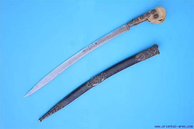 This Yataghan has a very unusual handle with big grips and long pommel ears beautifully decorated with filigree silver rosettes set with coral stones. The blade is engraved with Arabic letters and deeply marked with a maker stamp and dated to 1198 (1784 in the Gregorian calendar). Ivory grips with filigree silver grip strap set with ribbed coral stones. Leather covered scabbard with big filigree silver mounts also set with corals. Blade length 23 inches. Total length 32 1/2 inches. Very good condition. |