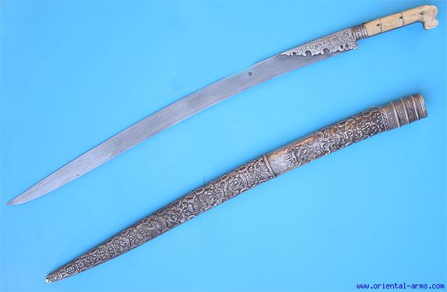 Up for sale is this very fine, complete, high quality yataghan sword. Finely forged blade from pattern welded steel in the pattern known as Turkish Ribbon achieved by forge welding of several twisted steel rods to one ingot. The blade is signed with a crisp maker mark. Walrus ivory grips with finely chased silver grip strap and bolsters. Finely chased whole silver scabbard with silver proof mark. Blade length 25 inches. Total length 33 inches. Very good plus condition. Age cracks on the grips but it holds very solid. Fine complete and untouched item. All parts original. Nor repairs or replacements.