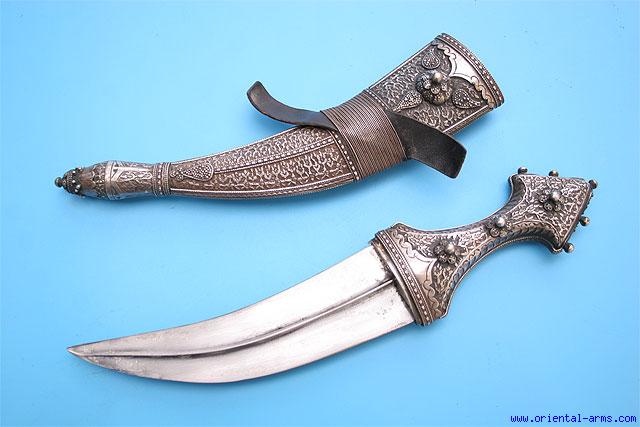 This Fine Jambiya dagger is mid 20 C. coming from the Western regions of Arabia, Hijaz and Asir. The blade is 7 inches long, well forged with a central rib. Finely chased heavy silver handle and scabbard with decorative granular work. Total length 14 inches. Excellent condition. A very impressive dagger. |
