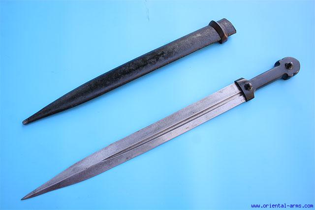 Up for sale is this Qama / Kindjal dagger, most probably Georgian, early 20 C. Well forged fine blade with off centered fullers. 17 inches long. Black hardwood handle with faceted dome shaped steel rivets. Leather covered scabbard. Total length 23 inches. Very good plus condition. |