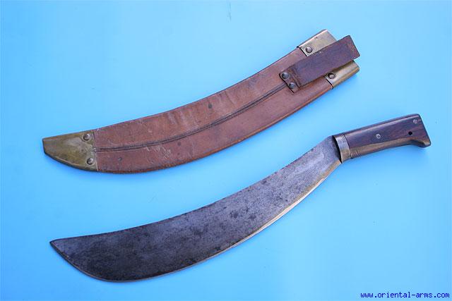 This heavy Bolo machete is American, mid 20 C., also used by the military. Up curving heavy blade Wood grips and heavy tooled leather scabbard with brass mounts. Blade 15 inches, total 23 inches.; Very good condition.