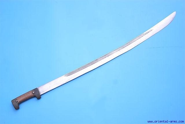 The traditional sword of the Bedouin tribes that live in the Sinai Peninsula, in Israel and in Jordan. The Bedouin sword smiths will use every available blade for their swords. This is a fine example with a well forged blade of good quality, probably a European trade blade. Blade length 291/2 inches. The horn grips are s riveted to the blade tang with three rivets and bound with copper wire. Total length 34 1/2 inches. Very good condition. No scabbard. |