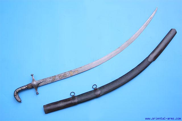 A very good Shamshir from Syria. The blade is forged from wootz (Damascus, watered steel), marked and signed with the maker sign and decorated with gold inlay work. It is 32 inches long, curved and single edged, probably of Persian origin. The cross guard is steel. The ‘Syrian’ attribution comes mainly from the shape of the hilt. The grips are horn inlaid with brass and lead dots and decorated with brass nails. The cross guard is secured to the grips with a twisted copper wire. The pommel is steel and it is sharply down curving (very typical Arab style). Wood scabbard covered with synthetic leather (later) with the original steel mounts decorated with typical silver koftgari work. Total length 37 1/2 inches. Very good condition. Minor edge nicks and blackened spots on the blade. Losses to the silver koftgari work on the scabbard mounts. |
