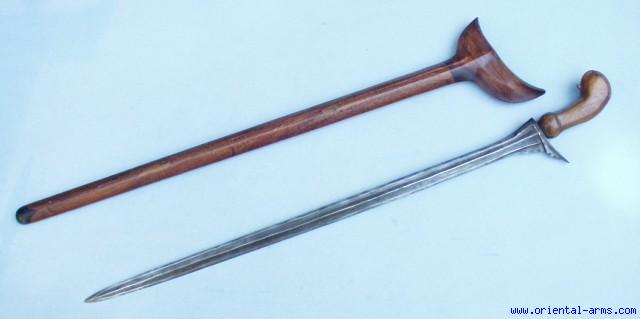 An Execution Keris dagger / sword from Sumatra. This rare type of Keris was used to execute criminals. The long narrow blade was inserted above the collarbone of the sitting executed person and pushed down directly into the heart, causing instant death. The blade of this specific Keris is 21 inches, narrow but thick with two flat fullers and acute tip. The hilt is wood of a Java Style keris (may indicate a later replacement) and the mendak (the small metal ring/fitting below the hilt) is missing. The scabbard is wood and the scabbard tip is horn. Very Good condition. It is a very rare version of the Indonesian traditional sword and you certainly do not see many genuine swords like this on the market. |