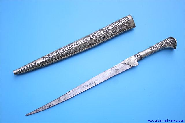 This unusual knife is a fine example of cross cultural influence in the field of arms and armor. A North African Flyssa blade that somehow crossed the Mediterranean and mounted with Balkan, most probably Greek mounts. Mid to late 19 C. Heavy short Flyssa blade 10 1/2 inches long. Finely chased low silver alloy handle and scabbard in a classical Greek pattern. Total length 14 1/2 inches. Very good condition. |