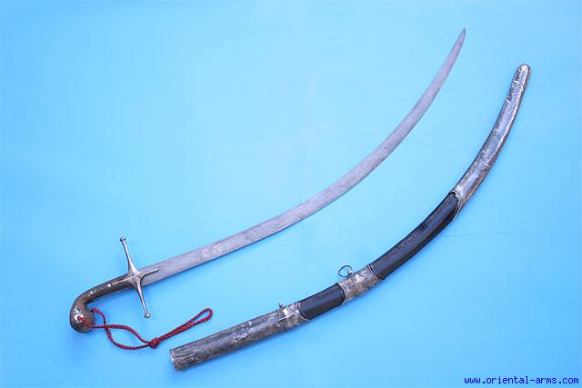 This Shamshir sword is Turkish with an 18 C. Blade and 19C. silver mounts. The blade is 33 inches long, of Persian origin, mid 18 C. forged from good wootz (Damascus, watered steel) in the rare pattern known as Kirk Narduban (ladder pattern). The blade is marked with a maker name in gold inlaid panel (true inlay). The classical shaped Turkish grips are rhino horn with silver grip strap and cross guard. Scabbard covered with black leather and mounted with silver mounts. All silver parts are stamped with a silver proof mark and the Tughra of the Sultan in the throne (Few examples are shown below) . Total length 41 inches. Very good condition. Minor dents cracks and repairs on the silver parts. The wood liners and leather are later. |