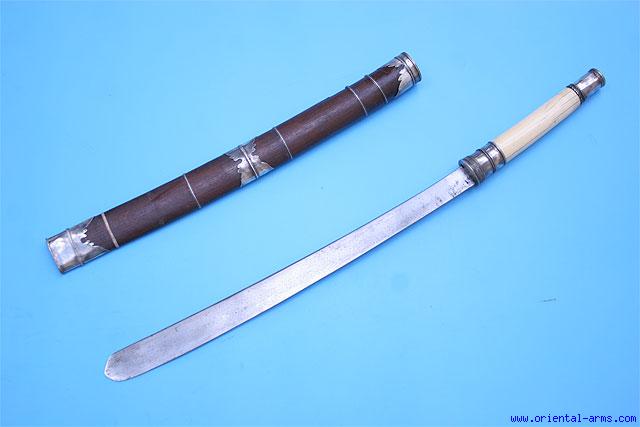 This Dah sword is Burmese, 19 C. Short heavy blade with ridged spine and spear shaped point, 18 1/2 inches long. Massive elephant ivory grip with silver mounts. Wood scabbard with silver mounts. Total length 27 inches. Very good condition. Minor cracks on the scabbard. |