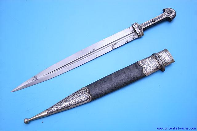 This Kindjal dagger is most probably from Dagestan, late 19 or early 20 C. Blade with classical off centered fuller, 15 inches long. Horn grips with nielloed silver mounts. Original scabbard with silver nielloed mounts. Total length 21 1/2 inches. Good condition. Minor edge nicks on the blade. Dents and minor loss of niello in the silver mounts. Scabbard tip repaired. Low price.
