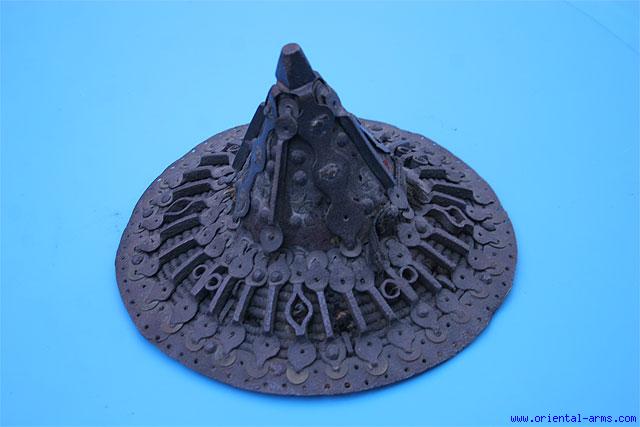 We offer for sale this very rare and unusual example of a 17C. Ottoman/Turkish arm war shield (Buckler). The shield is based on a central wooden core, bound with a spiral cane. The central piece is high, conical shaped dome and the outer circumference is made of steel ring. The central dome and the outer ring are connected with reinforcing steel bars and brass disks imitating old coins. Total diameter is 10 ½ inches, height 6 inches. Good condition to age. Very good age patina on all metal parts. Few of the reinforcing bars are loose. Losses to the inner fabric cover. The handles are missing. This is a real war shield, late 17 C. Very rare and uncommon. |