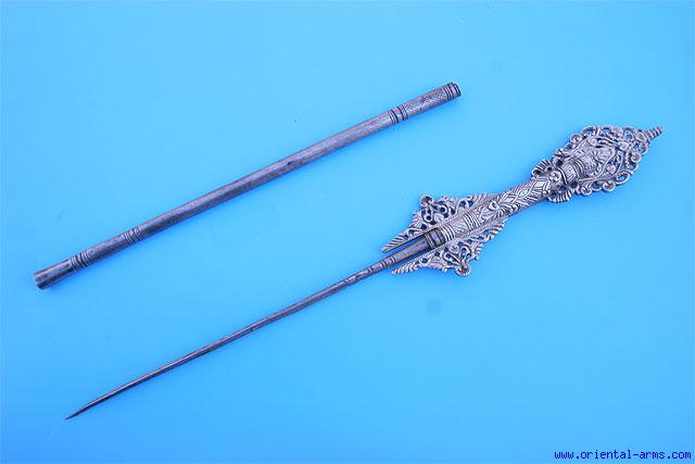 The Turkish warriors used this Suma as a Ramrod for their pistols. It was carried on the belt (sash) and was used also for other purposes, sometime including blades, tweezers etc. This fine example includes a 10 1/2 inches blade of hollow triangular cross section and beautifuly decorated silver handle. The sheath is steel Total length 19 1/2 inches. Very Good condition. Blade very slightly bent (and can be easily straighten) |