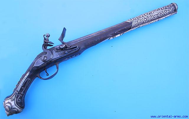 This pistol is of classical Turkish design and decoration, early to mid 19 C. , but may have been used in Greece or by Greek people. 13 inches barrel marked and stamped. Wood stock finely decorated with silver mounts, niello and silver wire work and coral inserts. Lock finely engraved and in working order (needs adjustments). The lower side of the lock plate is engraved with what might be Greek letters. Total length 21 inches. Very good condition. |