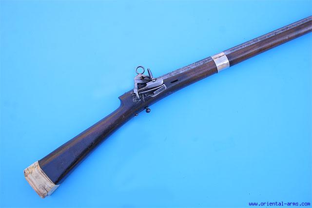 We offer here for sale this fine Caucasian Miquelet Rifle. The barrel is 45 inches long forged from fine twisted Damascus steel, clearly visible on its entire length and koftgari gold inlay on both ends of the barrel. The lock is a Miquelet type in very good working order, with the original flint still fastened in the cock jaws. The stock is walnut with large butt carved from a solid piece of ivory. Total length 58 inches. Very good condition. The ramrod is a replacement. |