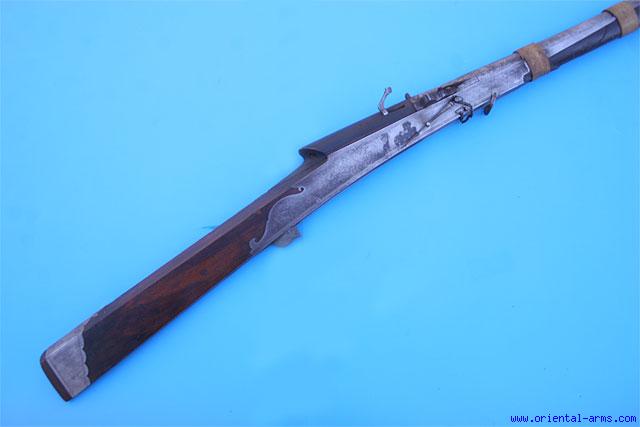 This is a Toradar an Indian Matchlock gun, probably late 18 ir early 19 C. 43 inches barrel with a dark wood stock mounted with steel plates lightly decorted with an engraved design. Chiseled steel ramrod. Total length 63 inches. Very good condition. All parts in working order. Low price considering its age and condition. |