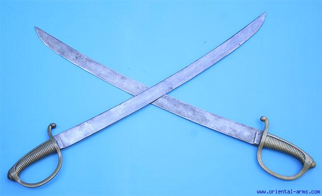 Up for sale is this pair (almost identical) of military side arms, probably Prussian, mid 19 C. 23 inches blades, one marked W & G. Brass handles. Total length 28 inches. Very good condition.