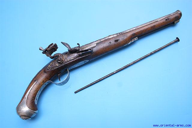 This flintlock pistol is Turkish, mid 19 C. 13 inches barrel beautifully chiseled at the top. Flintlock mechanism in working order. Silver rear plate. Wood stock with silver mounts mounts. Total length 20 inches. Very good condition. Upper part of the cock is restored. The silver back plate and trigger guard are restored. Few small silver inserts are missing. |