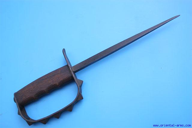 The famous fighting knife of the US Army WW 1 era, marked and dated U.S. LF&C. 1917 . Triangular blade 9 inches long. Wood handle with Knuckle duster D guard. Very good condition. Patches of light rust. No scabbard.