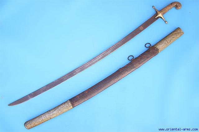 Up for sale is this Saber, with an old Turkish blade, probably late 18 C. The blade has traces of gold inscription in Arabic letters as well as a "Tughra", the emblem of the sultan in the throne. Some time in the end of the 19 C. The blade was fitted with Turkish style horn grips and brass cross guard, and a local made scabbard was made for it, covered with leather (spirally stitched) and mounted with white metal, crudely engraved locket and chape. This was done probably in Syria or in Palestine. Blade length 32 inches. Total length 37 1/2 inches. Good condition. Blade with age patina and some losses to the gold inscription. Grip strap and the brass twisted wires are recently restored. Small damage to the scabbard.