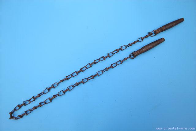 KAU SIN KE - A fighting chain. A very rare and unusual Chinese weapon. It is 43 inches long chain composed of many short steel square rods connected to swivel steel links and ending with heavy steel weights with swivel decorated tops. Very good condition. An unusual and attractive 19 C. item. |