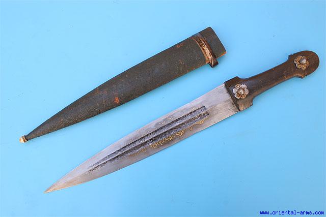 Early 20 C. most probably Dagestani, with good fullered and etched blade with traces of gold koftgari inlay work. Horn grip with steel rivet bosses with gold inlay work as well. Original leather covered scabbard with bone tip. Blade length 11 inches. Total length 17 inches. Very good condition. Some losses to the gold inlay work. |