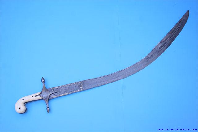 This very fine Kilij sword (Also known as Pala in some places) is of outstanding blade quality: Persian made for the Turkish market, early to mid 19 C., forged from Wootz steel of dark color and high contrast pattern. Chiseled inscription on in Arabic letters and maker mark all decorated with gold koftgari work. Ivory grips. Blade 29 inches long 2 inches wide. Total length 34 inches. Very good condition. Minor losses to the gold work. One grip repaired. A rare sword. |
