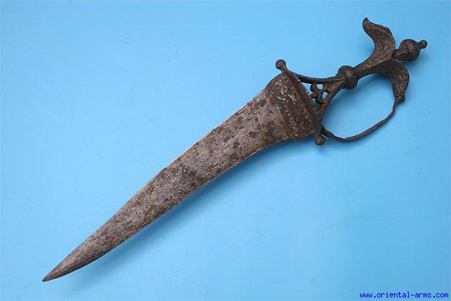 One of the rarest forms of daggers from the Indian arsenal, a member of a class of daggers known as Chillanum . Daggers in this class may take various shapes but all share the typical re-curving blade. This one probably early 17 C. from central or south India. 10 inches re-curving blade, a whole steel handle and D guard. Total length 15 inches. Good condition to age. Blade has seen sharpening attempts which left some grinding signs. The handle is pitted. |