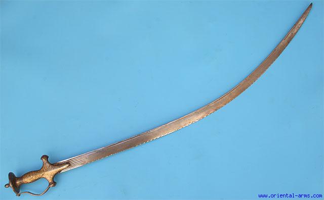 From our private collection we offer for sale this very fine Indian Shamshir sword. Late 18 C, with a serrated edge on its entire length. The blade is forged from very fine wootz (Damascus, watered ) steel of good contrast. The handle of Tulwar style is finely inlaid with gold koftgary work. Blade 34 inches. Total 39 inches. Very good condition. No scabbard. |