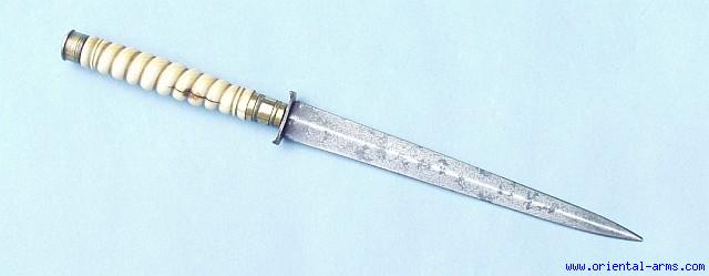 A very nice European dirk / dagger, probably of English origin. A double edge blade, 6 inches long of flat diamond cross section with traces of old engraving. Ivory grip with beautiful age patina, brass pommel, collar and cross guard. Good condition. Lightly blackened blade and an age crack on the ivory grip. Very elegant and attractive piece at a very low price.