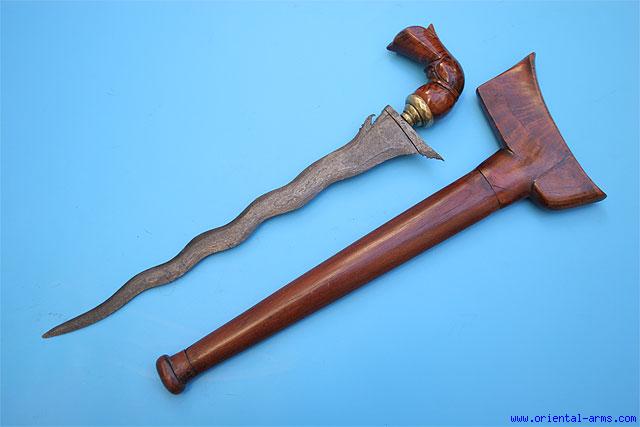 This fine Bugis Keris Dagger has a heavy old wavy blade 14 1/2 inches long, with clear nice pamor structure. The mendak is brass. The hilt and scabbard are carved from a beautifully grained wood. Total Length 18 inches. Very good plus condition.