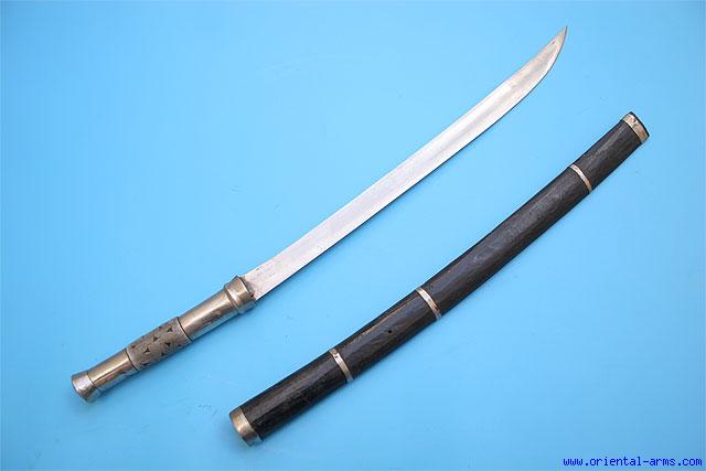This short sword is a dah, from Burma, early to mid 20 C. with a nicely fullered 18 inches blade. Handle with white metal mounts and aluminum covered grip. Wood scabbard with white metal bands. Total length 25 inches. Very good condition.
