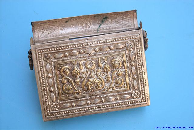 Not exactly a weapon but a very good example of early to mid 19 C. Ottoman decorative arts. This a silver box to old the Koran was in many cases part of the Turkish solider accessories, hanged on the belt. Low silver 5 X 4 inches with a hinged top. Finely chased with an additional chased brass panel at the front. Two rings for a carrying chain.. Very good condition. |