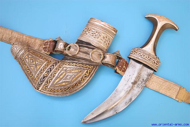 A very good Arab Jambiya dagger, mid 20 C. from Oman. It has 7 inches curved and dual edge blade of good steel with a pronounced central rib. The hilt is Rhino horn covered silver front panel and mounted with chased silver colla. The scabbard is “L” shaped covered with leather elaborately embroidered with gold and silver strips and wires, and mounted with chase silver locket en suite with the hilt mounts. The belt attachment is made of complicate arrangements of silver rings and twisted silver wire. Total length is 12 inches. Original silver / gold brocade belt. Very good condition. Minor pitted spots on the blade.