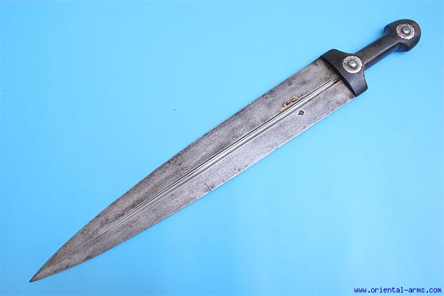 This heavy Qama short sword is Georgian, late 19 C. Heavy blade 18 inches long and 3 inches wide, nicely fullered and forged from laminated steel (The lamination can be noticed in the wide fuller). Deeply marked with a maker stamp on both sides of the blade. Traces of gold koftgari work on the blade. Massive single piece water buffalo horn handle riveted to the tang with silver rivets and bosses. Total length 23 1/2 inches. Very good condition. Good age patina on both the blade and the handle. Minor edge nick. No scabbard. Very impressive. |
