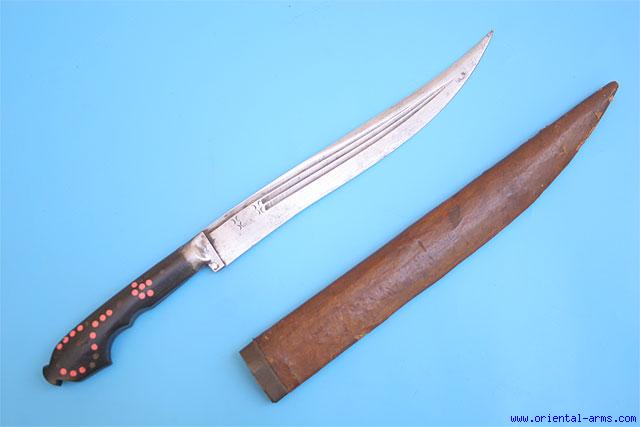 This knife is coming from Trabazon area, on the shores of the Black Sea, north Turkey. Late 19 to early 20 C. 9 inches blade very well forged and beautifully fullered. Black horn grips with red inserts (few missing) and steel bolsters. Leather covered scabbard. Total length 16 inches. Very good condition. One bolster lightly corroded. |