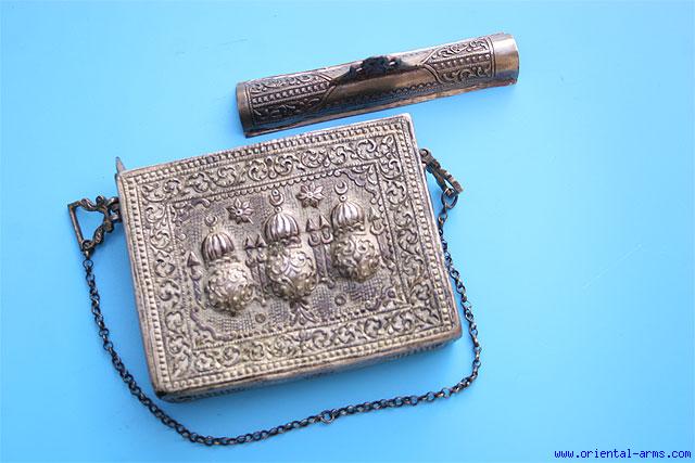 Not exactly a weapon but a very good example of early to mid 19 C. Ottoman decorative arts. This silver box to hold the Koran was in many cases part of the Turkish solider accessories, hanged on the belt. Low silver 5 X 5 inches with a sliding top. Finely chased on both sides. Two rings and a short silver chain.. Very good condition. Minor damage to the bottom. |