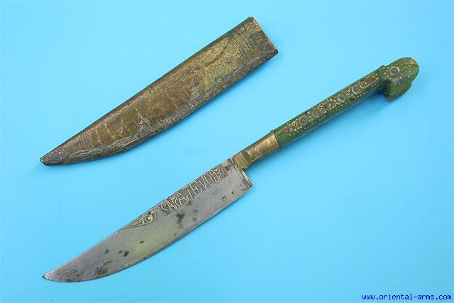 A typical knife from Bosnia & Herzegovina, from the very short period of independence before the annexation to the Austro-Hungarian Empire at the end of the 19th C. The blade is straight, single edge, 5 inches long, inlaid with silver inscription SARAJEVO 93 . The grips are green dyed ivory, set with brass nails and inserts in a typical balkan style of decoration. The scabbard is wood covered with thin chased brass. Total length 10 inches. Very good condition. Minor losses to the silver inlay. Dents on the scabbard. |