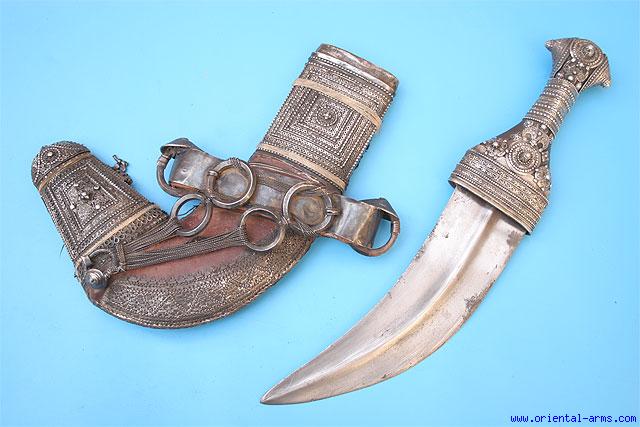A very good Arab Jambiya dagger, late 19 C. from Oman, in the royal style known as Al-Bu-Said, or Saidi style. It has 7 1/2 inches curved and dual edge blade with a pronounced central rib. The hilt is rhino horn richly covered silver filigree pieces. The scabbard is “L” shaped covered with leather and mounted with filigree silver locket and chape, also decorated with embroidered silver strips. The belt attachment is made of complicate arrangements of seven silver rings and twisted silver wire. The total length is 13 inches. Very good condition. Minor blackened spots on the blade. |