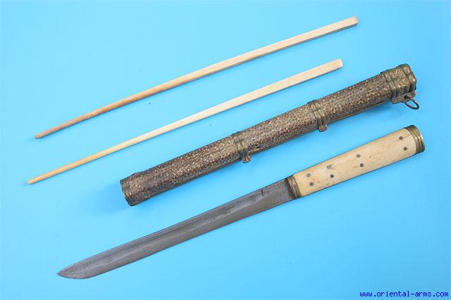 A Chinese ‘trousse’ (eating set), comprising a knife and chopsticks. This type of sets was very common in china and in all the countries under the Chinese influence from Tibet to Mongolia. It was part of a man formal dress up to the turn of the 20th century and usually accompanied with a variety of accessories like pickle spear, toothpicks, tweezers and the like. Similar sets are found in various sizes and quality. This one has a 7 inches blade, nicely fullered, bone grips and brass pommel. Scabbard is wood covered with Sting Ray skin and brass mounts. Chopsticks are bone. Total length 12 inches. Very good condition. Grinding signs on the blade. |