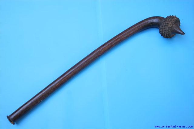 Up for sale is this 19 Century war club from the Fiji island, also known locally as Toko, and in the tribal collectors world as Pinapple Club. The 38 inches long, heavy club is carved from dark hardwood, usually taken from the root of the tree. The head is perpendicular to the handle and is carved with lines of sharp "thorns" or teethes all around, ending with a conical spike. Good condition. Shining age patina. Worn and few missing "thorns" on the head and the tip of the spike is slightly chipped. Age cracks on the handle but holds very solid. A real piece for the connoisseur of Ethnographic/Tribal artifact and the weapon collector. For a similar one, see: G.C. Stone, Glossary... Page 184 fig 232 # 10.