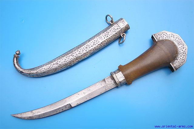 Up for sale is this very fine and early Koumaya Dagger from Morocco, dated to 298. Classical blade, 9 1/2 inches long, double edged at its lower half and single edged at the top. The handle is carved from a single massive piece of Rhino horn with a very clear fibrous structure. Chased silver grip collar and big chased silver pommel. Wood scabbard covered with chased silver in a classical Moroccan design. The scabbard as well as the pommel cap are marked with silver proof mark and dated 298 (standing for 1298, 1881 in the Gregorian calendar). Total length 16 1/2 inches. Very good plus condition. |