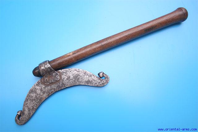This axe is Indian, 17 C. or earlier, massive steel head with concave 11 inches edge and simple engraved decoration on its spine. It is mounted on a later, 19 or early 20 C. short wood haft 18 inches long.